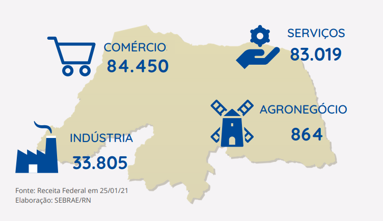 A indústria tem 33.805 pequenas empresas e no agronegócio o total é de 864 pequenos negócios, incluindo propriedades rurais. O Rio Grande do Norte segue uma tendência nacional, cuja configuração apresenta uma leve predominância no setor de serviços, que concentra a maior quantidade de pequenas empresas do país: 8,7 milhões. Já o comércio reúne cerca de 6,6 milhões de pequenos negócios. A indústria e o agronegócio brasileiros totalizam 3,6 milhões e 92,2 mil negócios, respectivamente.