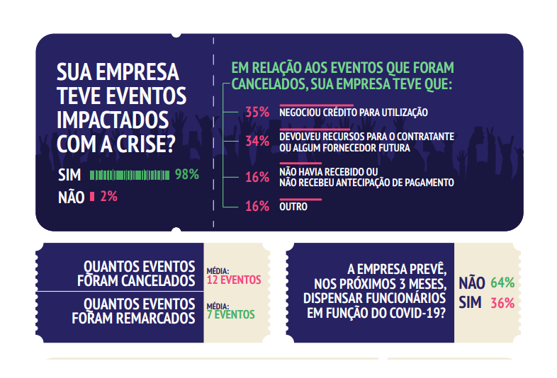 Segundo o levantamento do Sebrae, que ouviu 2.702 empresas, 98% delas foram impactadas pela pandemia do coronavírus – com uma média de 12 eventos cancelados por empresa. Mesmo diante desse cenário, 51% das empresas optaram pelo trabalho online e 33% deram férias aos trabalhadores, enquanto 43% dispensaram funcionários. De acordo com os entrevistados, 64% não pretendem fazer dispensas nos próximos três meses.