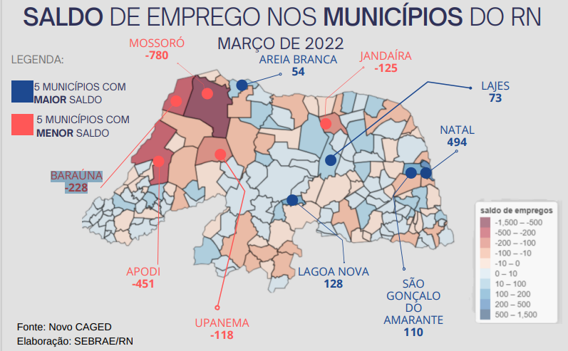 De acordo com o Mapa do Emprego do RN, na capital foi onde ocorreu a maior abertura de novas vagas no mês. Foram 494 novos empregos criados. Já o município de Lagoa Nova gerou 128 novas frentes de trabalho, enquanto São Gonçalo do Amarante criou outras 110. Por outro lado, Mossoró foi a cidade que teve as maiores perdas. Ao todo, foram encerradas 780 vagas. A segunda cidade no ranking de demissões em março foi Apodi, que perdeu 451 postos de trabalho, seguida por Baraúna, com 228 vagas perdidas.