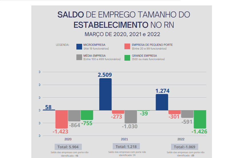 Em relação aos pequenos negócios, que é a soma dos saldos entre as microempresas e empresas de pequeno porte, o estado teve um saldo positivo de vagas criadas: 973 empregos criados no terceiro mês de 2022. Mas, esse número, é quase 56,5% menor que o quantitativo de vagas criadas por essas duas categorias empresariais em março do ano passado, quando foram abertas 2.236 novas vagas.