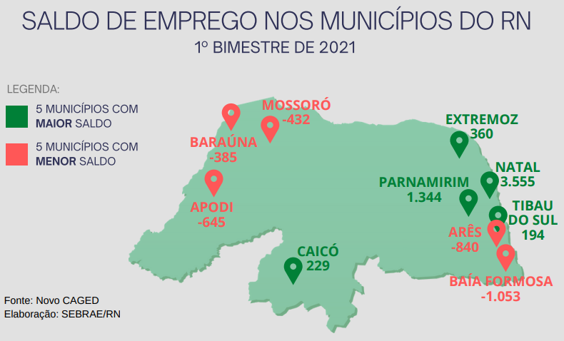 O município de Parnamirim acumula um saldo de 1.344 novas vagas, seguido de Extremoz (360 vagas) e Caicó (229 vagas). Os municípios onde houve as maiores quedas no número de vagas foram Baía Formosa (- 1.053 vagas perdidas), Arês (- 840 vagas perdidas), Apodi (-645) Mossoró (432 vagas perdidas) e Baraúna (-385 vagas).