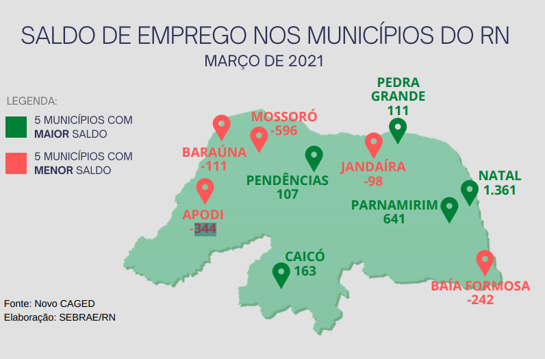 O Mapa do Emprego no RN feito pelo Sebrae indica as cidades onde ocorreram mais contratações e mais desligamentos no período. E, em março, Natal continuou responsável por alavancar o saldo de novas contratações. A capital do Rio Grande do Norte abriu 1.361 novas vagas de emprego formal. O município de Parnamirim gerou no mês um saldo de 641 novas vagas, seguido de Caicó (163 vagas) e Pedra Grande (111 vagas). Os municípios onde houve as maiores quedas no número de vagas foram Mossoró (596 vagas perdidas), Apodi (344 vagas perdidas) e Baia Formosa (242 vagas perdidas).
