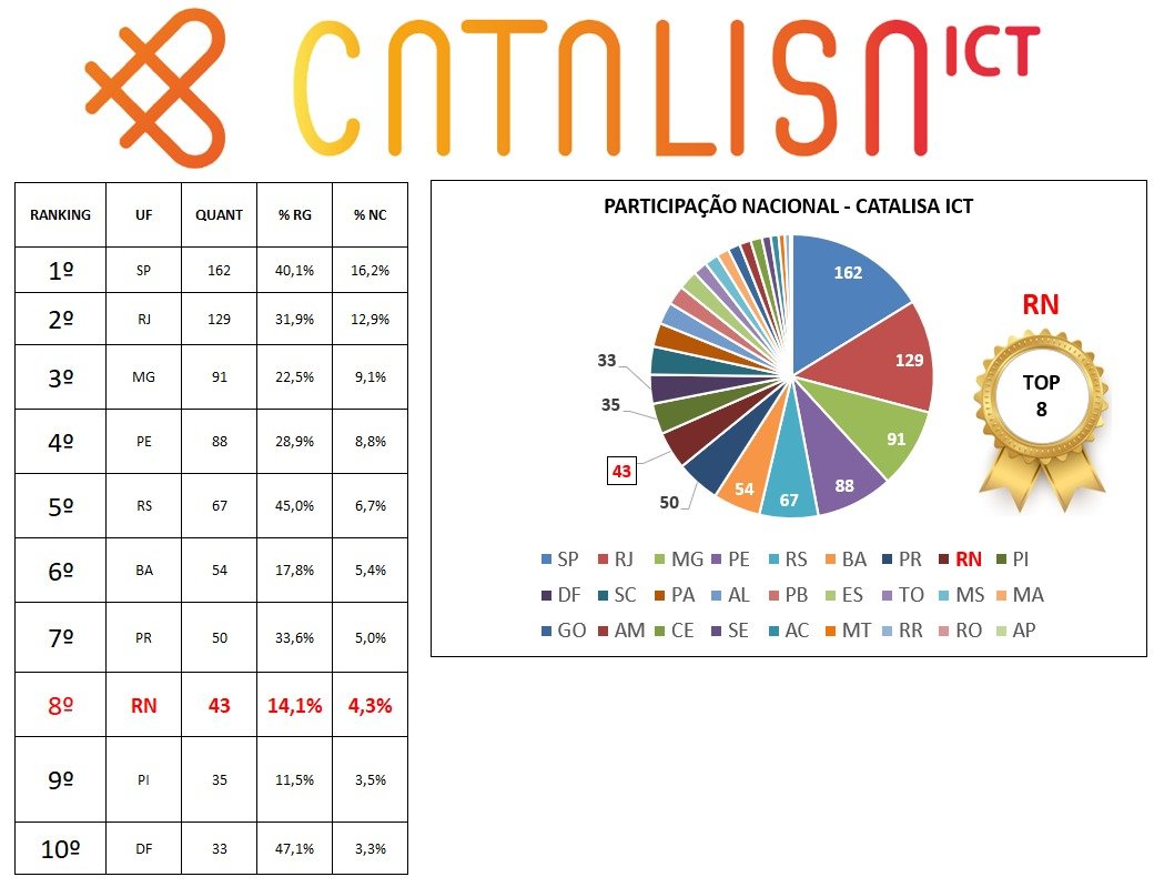 A relação dos projetos selecionados foi divulgada pelo Sebrae. Confira aqui os 43 selecionados. No Rio Grande do Norte, que ocupou a oitava posição no ranking nacional em números de projetos aprovados, o programa foi apresentado no final de novembro de 2020 para pesquisadores do estado. O Programa Catalisa ICT oferece capacitação em gestão, mentorias, fomento a projetos e acesso ao universo empresarial. A próxima fase é a de capacitação, estruturação, desenvolvimento e teste, inovação e, por fim, de escala.