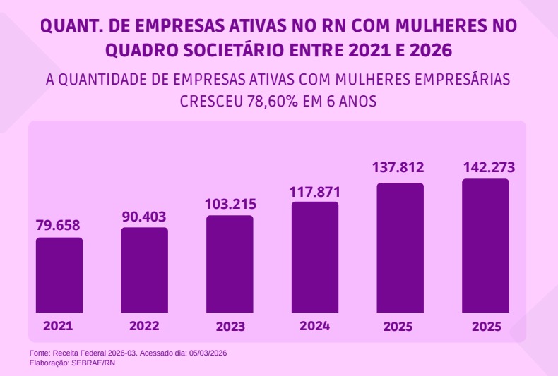 A presença feminina no empreendedorismo segue em expansão no Rio Grande do Norte. Levantamento elaborado pelo Sebrae, com base em dados da Receita Federal, mostra que o número de empresas com mulheres no quadro societário no estado cresceu 78,6% nos últimos seis anos, passando de 79.658 em 2021 para 142.273 em 2026.