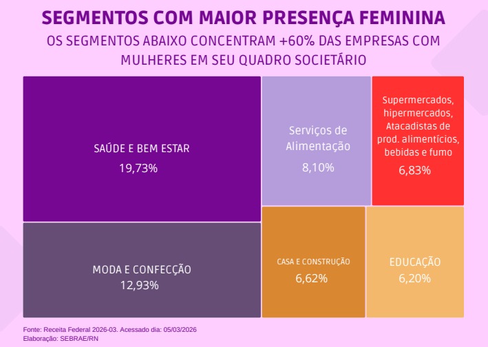Entre os principais portes empresariais, as mulheres têm presença significativa na gestão de negócios no estado. Entre os 150.060 microempreendedores individuais (MEI) registrados no RN, 68.042 são gerenciados por mulheres. No universo das 111.494 microempresas, 50.204 têm gestão feminina, enquanto entre as 17.325 empresas de pequeno porte, 8.111 são administradas por mulheres.
