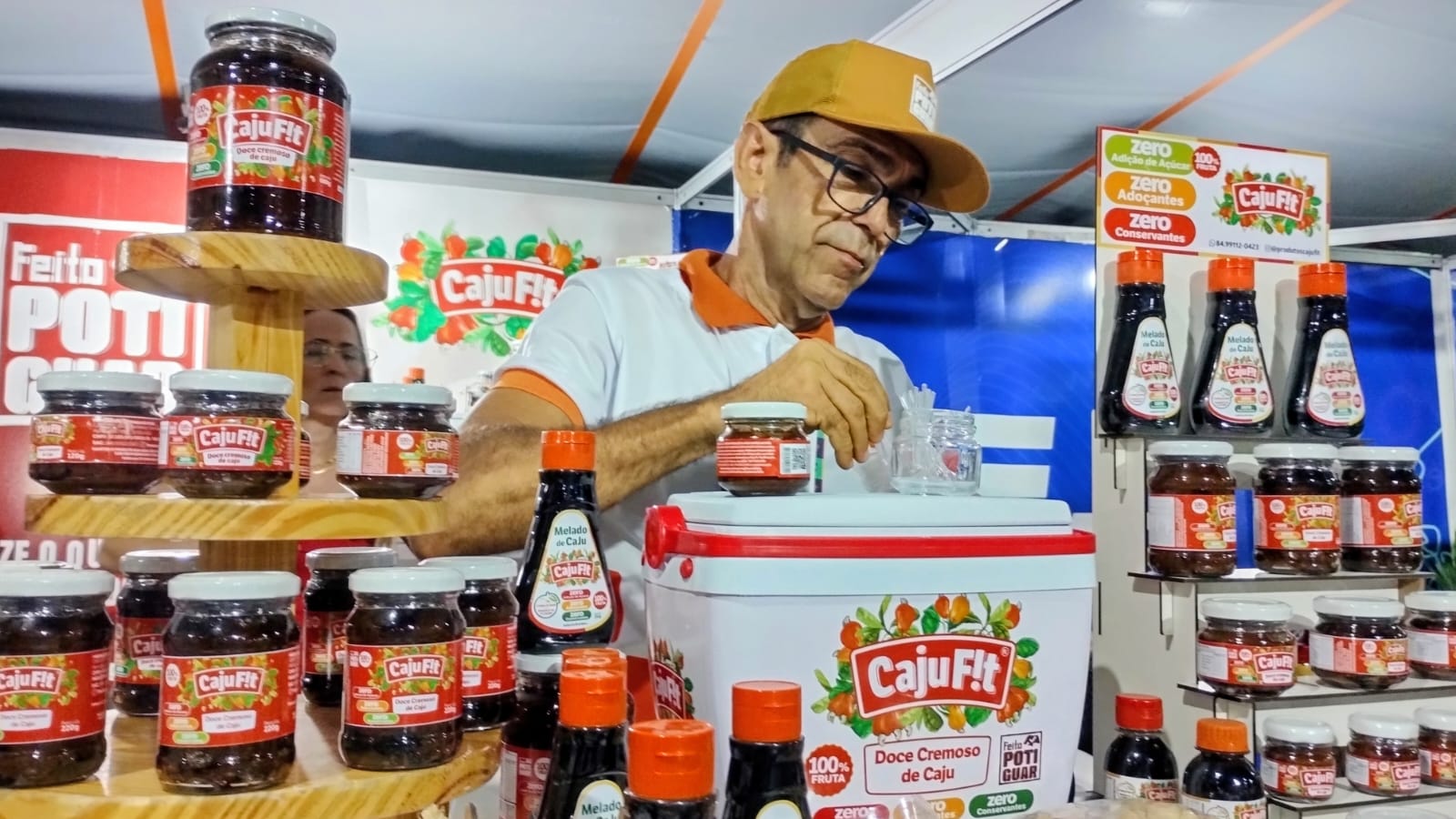 O Feito Potiguar está presente, também, no estande do Sebrae instalado na Femulti. No local, pequenos negócios com produtos certificados pelo Programa expõem e atraem visitantes com os sabores diferenciados de suas produções. É o caso da Cajufit, empreendimento genuinamente apodiense, que produz doce de caju natural, sem açúcar e sem conservantes. Proprietário da empresa, Milton Cortez avalia que os ganhos com a participação no evento vão além da exposição, e eleva a comercialização da sobremesa produzida por ele.
